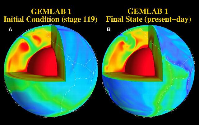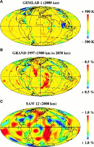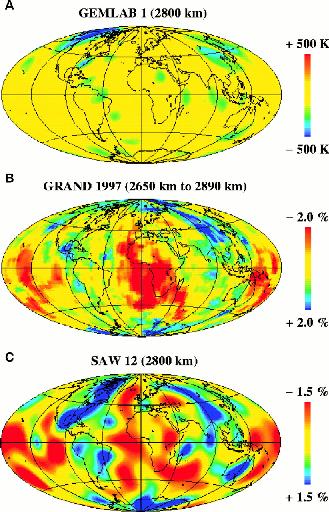 Some characteristics of GEMLAB1 are similar to those of Grand's S-wave study, but there are important differences. For example, the cold subduction-related CMB temperature pattern in GEMLAB1 correlates well with the seismic models, but there are no prominent hot regions with temperatures substantially above the mean. This result is expected inside a hot thermal boundary layer and suggests that the very low wave-speed anomalies may not represent purely thermal effects. They may, however, result from chemical heterogeneity, which may also help to explain why some of the low wave-speed anomalies are confined to the deeper mantle.