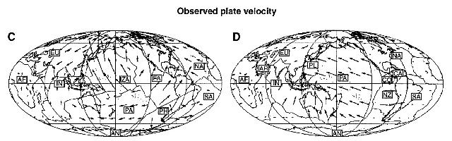 20. The plate tectonic information consists of 11 plate-motion stages extending back to 119 Ma. During a stage, plate motions are relatively constant. Stage boundaries correspond to episodes of large or sudden changes in plate motions, that is, plate rearrangements. Plate stage information consists of the complete plate boundaries for all the major plates and the Euler rotation vectors of each plate. The first six plate stages (0 to 10, 10 to 25, 25 to 43, 43 to 48, 48 to 56, and 56 to 64 Ma) span the Cenozoic and are based on the global plate boundaries and rotation poles of Gordon and Jurdy (30); the remaining five Mesozoic plate stages (64 to 74, 74 to 84, 84 to 94, 94 to 100, and 100 to 119) are based on the global compilation of Lithgow-Bertelloni and Richards (31). All plate boundaries and rotation poles are in the hotspot reference frame. The inherent uncertainties associated with using plate tectonic information in geodynamic models are described in (31). Many of the Mesozoic reconstructions, particularly for plates that have disappeared (Izanagi, Phoenix, Kula) or are in the process of disappearing (Farallon), are only approximate, especially the positions of subduction zones and to a lesser extent the rotation poles.