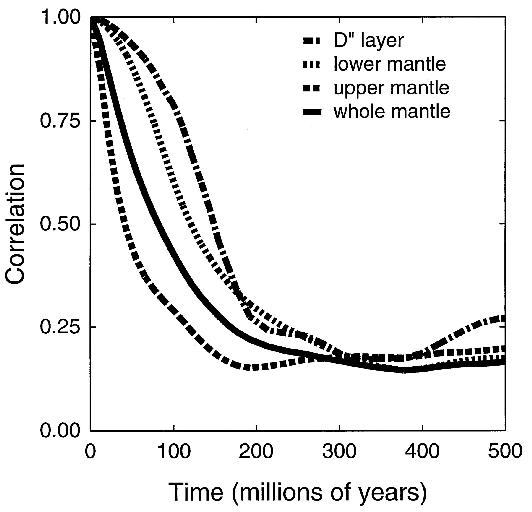 Our seventh assumption is the most problematic, so we tested how mantle convection responds to a realistic change in plate movement. We first imposed 119 to 100 Ma plate motions for 2 billion years to produce an initial condition (Fig. 1A). We then imposed present-day plate motions for 500 million years (My). The global cross-correlation of the evolving mantle temperature field with the initial condition starts from exactly one [perfect correlation (Fig. 2)] and evolves toward a final stage, at which nearly all initial-condition information is lost. Most of the adjustment occurs during the first 150 My, and the correlation falls to about 0.3. It reaches a value of about 0.2 in the remaining 350 My, which reflects the correlation of the Mesozoic and the present-day plate configuration. The CMB correlation also declines rapidly to about 0.4 during the initial 150 My, accelerated by our inclusion of about 20% core heating (18, 26).
