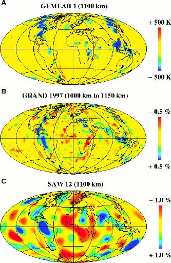 Fig. 3. (left). Maps of de-meaned lateral heterogeneity at a depth of 1100 km. (A) The standard Earth model GEMLAB1 described in the text. The seismic shear wave models are from Grand (B) and Li and Romanowicz (C). For the convection model, blue is cold and red is hot. For the seismic models, blue is fast and red is slow.