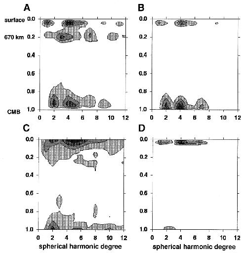 Fig. 6. (right). Spectral heterogeneity maps (SHMs) for GEMLAB1 (A), and the seismic model of Grand (D) and Li and Romanowicz (C). GEMLAB2 (B) is similar to GEMLAB1, but without the strong phase transitions. Root-mean-square spectral amplitude is contoured as a function of nondimensional mantle depth (surface at the top, CMB at the bottom) and spherical harmonic degree (0 to 12). Each panel is normalized to the maximum amplitude for that panel, and there are five contour intervals. The SHMs show a low-degree structure in the upper and lower boundary layer, which gives way to a whiter spectrum in the midmantle. In GEMLAB1, an additional pronounced heterogeneity is seen in the transition zone because of the strong endothermic phase transition at a depth of 670 km.